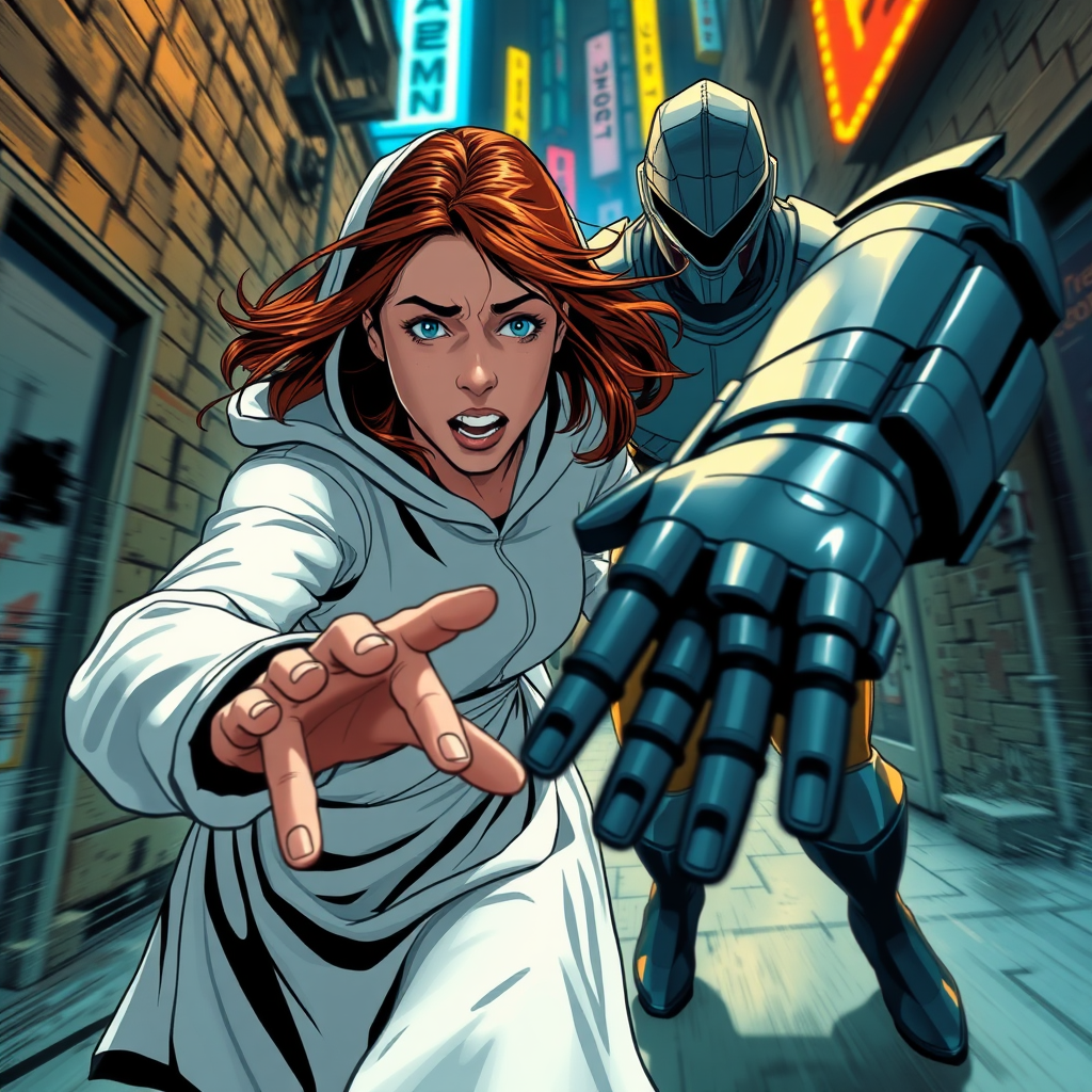 Close up of two subjects: a girl with auburn hair in a long-sleeve white hooded dress, terrified, desperately fleeing from a man in sleek armor who's reaching out to grab her, set in a grimy alley of a futuristic city illuminated by blue and yellow neon lights, an intense chase scene with a dramatic camera angle, comic book style featuring bold outlines, realistic skin and perfect hands, action lines and motion-blurred background enhancing the sense of speed and urgency.