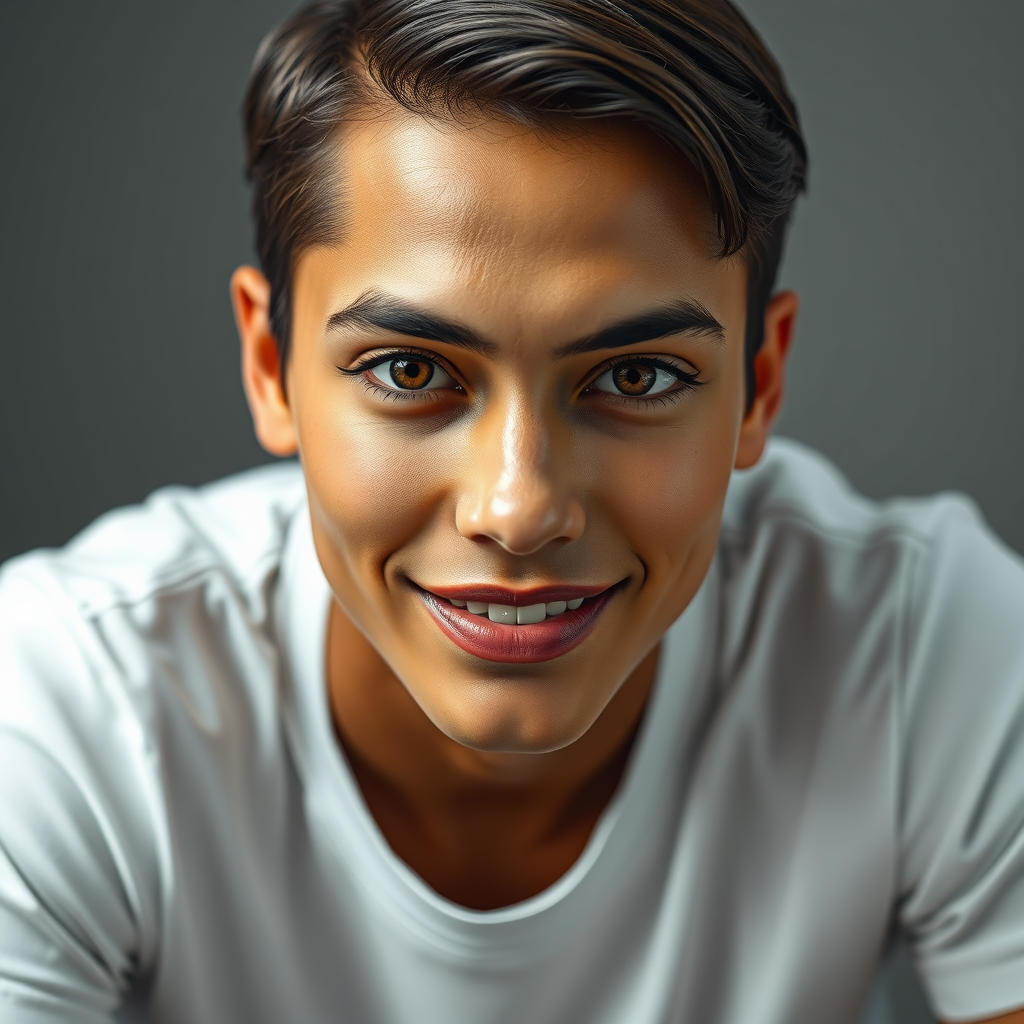 Close-up photo of a stunning model with brown eyes, wearing a crisp white t-shirt, photorealistic, high contrast, 8k HD, incredibly detailed, hyper-realistic skin texture, premium quality, ultra-high resolution, raw photo, striking lighting, rendered in unreal engine, smiling, with chic short hair. Avoid skin spots, acne, blemishes, and ensure perfect anatomy. Featuring a straightforward, clean composition without errors or distractions such as text, signature, watermark, or any unnecessary elements. No blurriness, distortions, or misshaped features, and no extraneous or missing limbs. Maintain a focus on sharp, vibrant realism and graphical fidelity, ensuring the image quality is the foremost priority.
