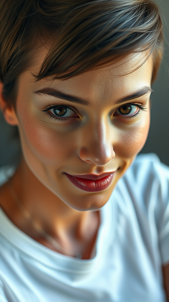 Close-up photo of a stunning model with deep brown eyes, wearing a crisp white t-shirt. The image is photorealistic with striking high contrast, presented in 8k HD for exceptional detail. The model's realistic skin texture is hyper-detailed, showcasing the best quality in ultra high resolution. Captured as a raw photo, the dramatic lighting highlights her features beautifully. Created with unreal engine technology, she smiles gently with her short hair perfectly styled. The photo focuses on authentic beauty, steering clear of any imperfections, maintaining flawless proportions, and is free from any artifacts or distortions, ensuring an impeccably detailed and elegant portrait.