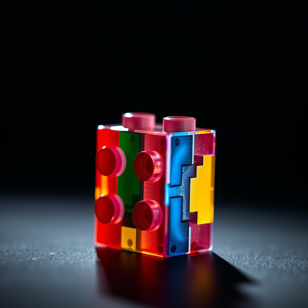 Close-up photograph of a single Lego piece, showcasing vibrant and artistic color variations under studio lighting, captured with a GF32-64mm f/4 lens to emphasize intricate details and textures. Subtle shadows and highlights add depth, creating a visually striking and dynamic image.