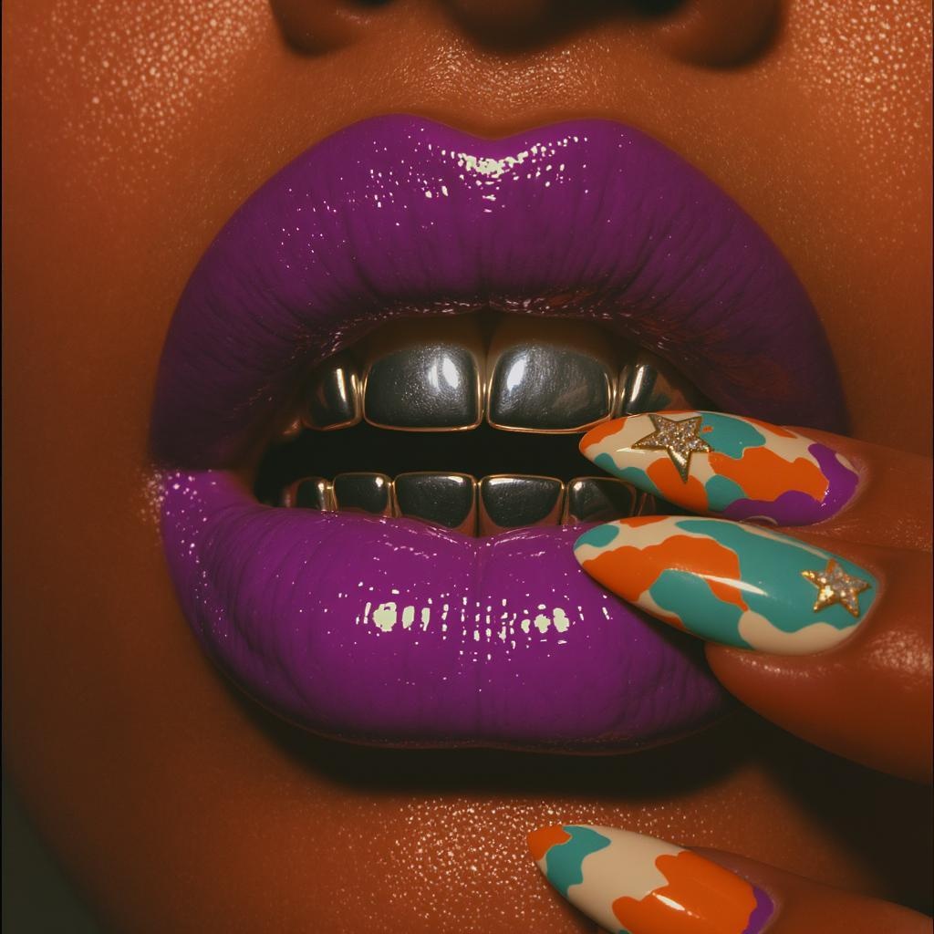 Close-up photograph of lustrous purple lips, slightly parted to reveal a sleek silver grillz. The lips are coated in a high-shine, wet-look gloss that dramatically reflects the light. Elegant, vibrant acrylic nails with a bold abstract pattern of orange, teal, and cream press gently against the lips, with one nail featuring a golden star charm encircled by tiny rhinestones. The lighting is moody and cinematic, casting warm amber hues and soft shadows. The image has a grainy, film-like texture, echoing high-fashion editorial photography. Captured with a macro lens, shallow depth of field, high contrast, vintage 35mm film aesthetic.
