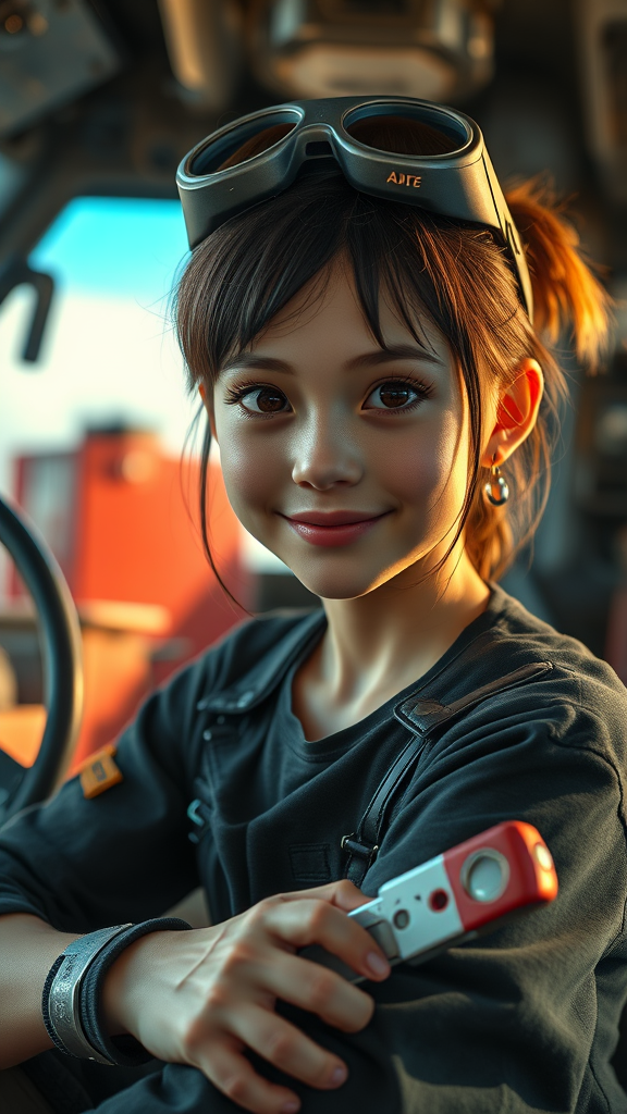Close-up photographic front view shot, centered, portrait, cinematic shot of a young mechanic girl sitting and enjoying the afternoon, featuring a cute, happy, and energetic expression. The scene captures an ultra-detailed mechanic interior with a dystopian vibe in the background. Focus is on her detailed face and eyes, showcasing innocence, along with a detailed nose, mouth, and lips. She is surrounded by an ultra-detailed wench and screwdriver as accessories, creating a vibrant and colorful 2D illustration, emphasizing character design and vector illustration. This masterpiece, inspired by Ghost in the Shell, employs a stunning and beautiful style.