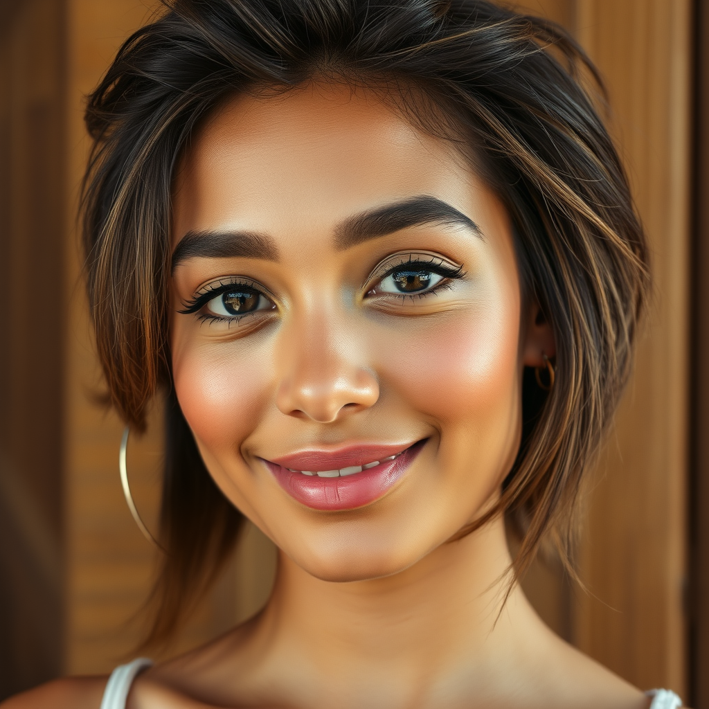 Close-up Polaroid portrait of a 24-year-old Mizo-Lebanese woman with captivating, exotic allure and a warm, welcoming expression. Her skin glows with a medium-tan tone kissed by the sun, revealing a subtle olive undertone. She wears understated makeup, highlighted by a soft blush on her cheeks and lips in a natural rose hue. The texture and pores of her skin are sharply focused, adding authenticity. Her deep brown octagonal eyes exude gentleness, encased by long, graceful eyelashes. She sports a tousled shaggy bob, adding a playful touch to her appearance. Her eyebrows are meticulously groomed, complementing her refined facial features.