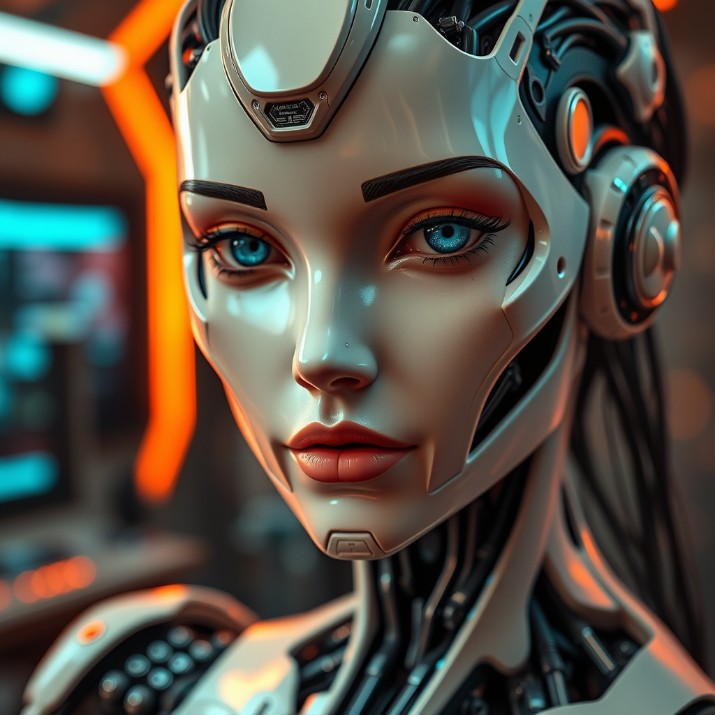 Close-up, portrait, cinematic shot, intricate robotic girl, elegant android, human-like, detailed robotic features, futuristic room background, vibrant colors, high contrast, HDR, UHD, masterpiece quality, professional artwork, intricate design, detailed expressive robotic eyes, nose, mouth, and body, ultra-detailed futuristic theme, vibrant colors, high dynamic range, striking visuals, complex textures, robot-human blend, artistic fusion, sleek and polished, cybernetic elegance, captivating design, visually immersive, creative synthesis, futuristic art, digital masterpiece.