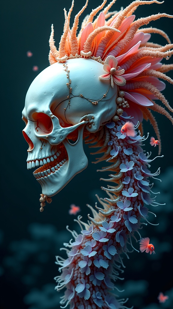 A mesmerizing close-up portrait of a goddess, featuring a skull with a striking mohawk and elements of a ram skull. The fusion of skeletal structures creates an intricate thorax and backbone resembling a jellyfish. A phoenix rises, with a head reminiscent of a nautilus shell intertwined with orchid petals. Betta fish and other bioluminescent creatures dance around, woven into the art. This piece, inspired by Tooth Wu, wlop, and beeple, showcases hyper-realistic detail with octane render, echoing the works trending on ArtStation and the style of Greg Rutkowski. The artwork is captured in stunning 8k resolution, marked by harmonious symmetry and cinematic realism.