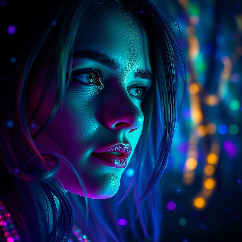 Close-up portrait, dreamlike woman, slightly off-centered, gazing into the distance, she is enveloped in vibrant neon lights, colorful, bioluminescent glow; background of an enchanted forest, vivid neon realm, particles of blue, green, and purple dancing around; crafted with golden ratio, featuring hyper-maximalist, octane render techniques, blending photorealism and cinematic realism in an unreal engine environment, 8k detail, with an asymmetric composition, creating a surreal, otherworldly atmosphere.