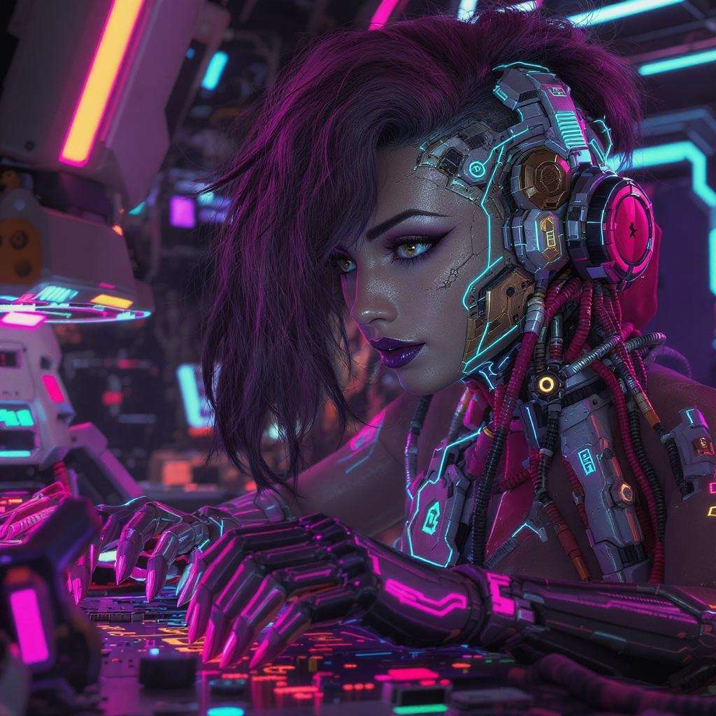 View this AI-generated image featuring a detailed close up portrait of an inspired female cyberpunk biohacker at her workstation featuring a vibrant and dynamic atmosphere with volumetric lighting the image captures a beautifully crafted futuristic setting with precise line art and intricate details