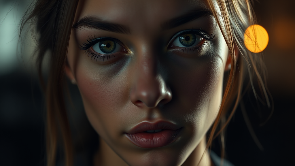 Close-up portrait of a 20-year-old woman with captivating features, taken with a Nikon D850 and Nikon AF-S 105mm f/1.4E lens, showcasing incredible detail in 8k resolution. The image presents hyper-realistic and lifelike textures under dramatic, chiaroscuro lighting, emphasizing the contours of her face. Her expression is serene yet intriguing, drawing attention to her striking eyes. The background is softly blurred, enhancing the focus on her visage, while subtle hints of color in the lighting add depth and mood to the composition, maintaining its CyberRealistic essence.