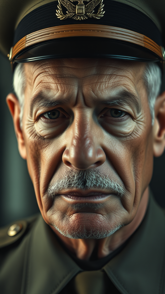 Close-up portrait of a 62-year-old experienced and decorated military general, clean-shaven, with a stern and stoic expression. The image is cinematic in style, captured in 4k with exquisite detail. The general's weathered skin and sharp features are highlighted against a softly blurred background that lends a sense of depth. The lighting is dark and moody, reminiscent of an HBO drama, and adds an epic quality to the scene. Shot on Kodak film, the photograph presents a rich texture and a timeless quality that conveys strength and resilience.