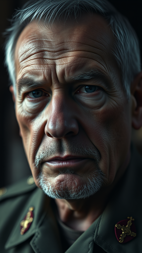 Close-up portrait of a 62-year-old resilient decorated general, clean-shaven, with a stern and stoic expression, captured in an epic 4k cinematic photograph. Shot on Kodak film to emphasize rich details and a soft bokeh background, evoking a dark, moody atmosphere reminiscent of an HBO drama. This image captures the essence of strength and leadership.