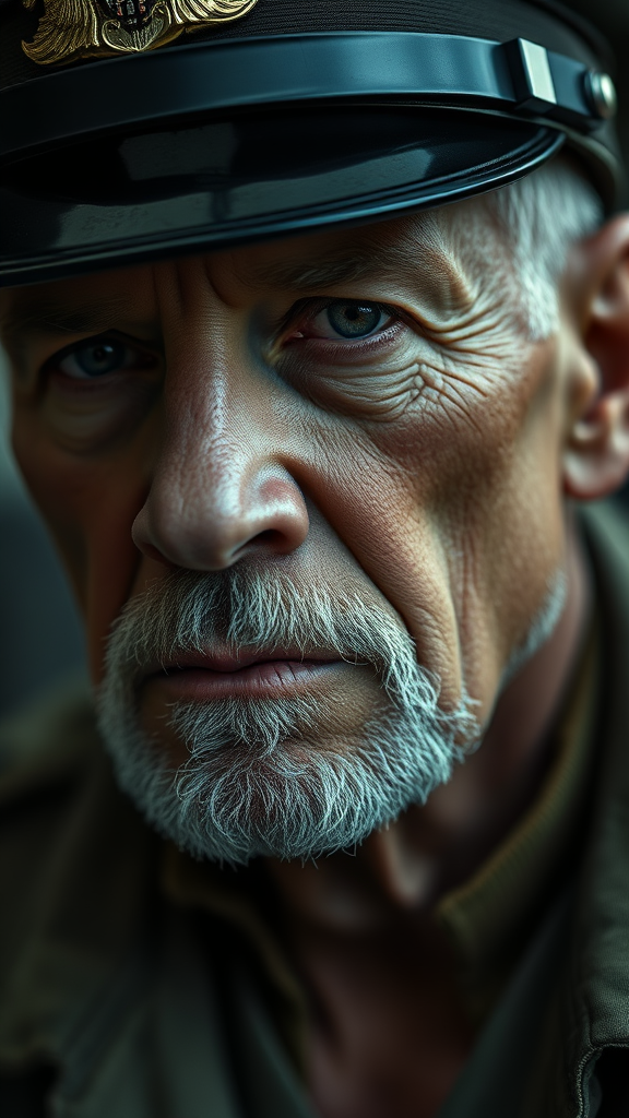 Close-up portrait of a 62-year-old seasoned and formidable general, clean-shaven with a serious, stoic expression. The image captures a cinematic, epic vibe in 4k detail, reminiscent of an HBO series poster. Shot on Kodak film, the photograph features a detailed bokeh effect with dark, moody tones, emphasizing the depth and character of the general's face.