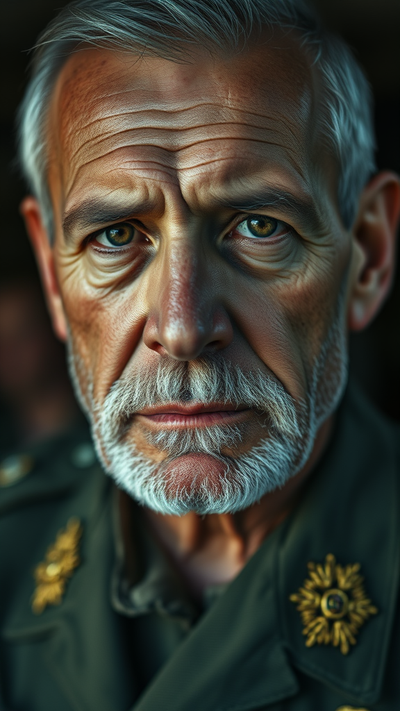 Close-up portrait of a 62-year-old seasoned, distinguished general, exuding toughness and resilience. His clean-shaven visage reflects a life of discipline, with serious, stoic eyes that seem to hold countless stories of valor. Captured in crystal-clear 4k, the photograph presents an epic, cinematic view, reminiscent of an HBO drama's dark, moody atmosphere. The intricate details of his decorated uniform are sharply in focus, while the background melts into a soft, detailed bokeh, shot on Kodak film to enhance the textured realism of every feature.