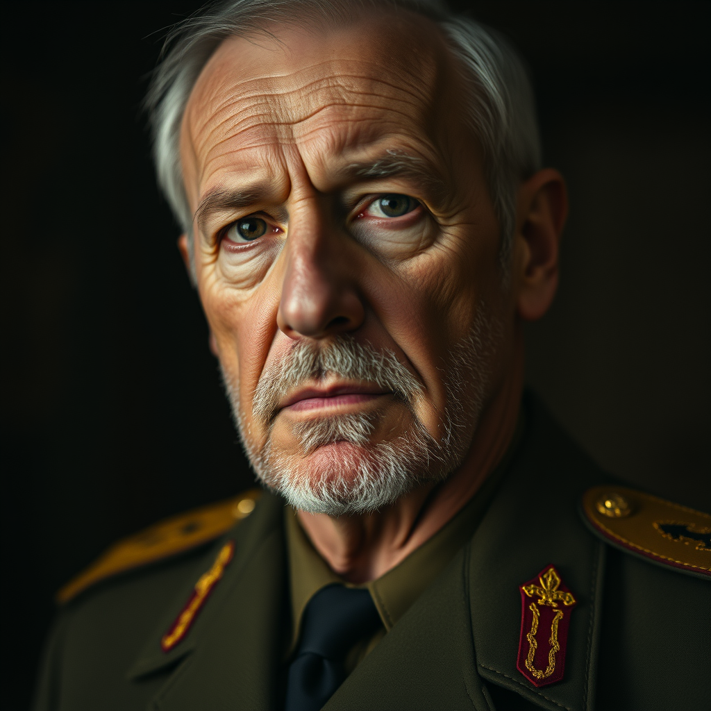 Close-up portrait of a 62-year-old seasoned general, clean-shaven, exuding a serious and stoic demeanor. The cinematic 4k photograph captures intricate details, shot on Kodak film, with a richly textured bokeh that enhances the dark, moody atmosphere reminiscent of an epic HBO scene. The general's decorated uniform speaks to his storied career, while his piercing gaze reflects wisdom and strength, inviting a sense of respect and intrigue.