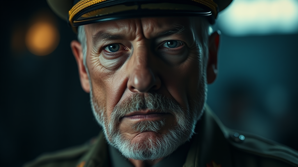 Close-up portrait of a 62-year-old tough and decorated military general, clean-shaven with a serious and stoic expression. The cinematic image is in 4K ultra-high definition, capturing intricate details and depth. Shot on Kodak film, the photograph features a dark, moody aesthetic with a beautifully detailed bokeh background, reminiscent of an epic, atmospheric HBO series.