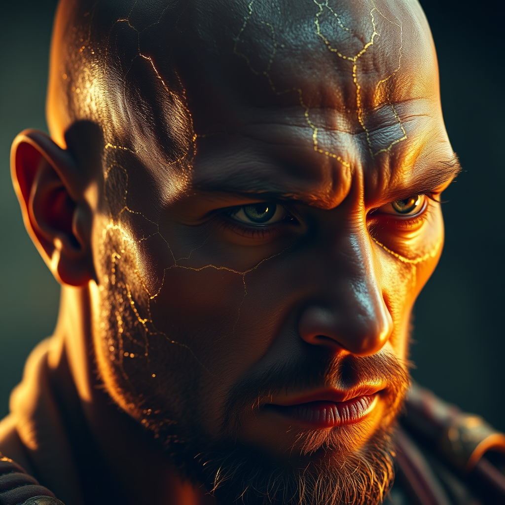 Close up portrait of a bald warrior with intricate gold veins shimmering across his skin, reminiscent of Ben Templesmith's style, high-resolution, hyper-realistic photograph, captured with professional photography techniques, dramatic cinematic lighting casting dynamic backlight, adding intensity to his focused expression.