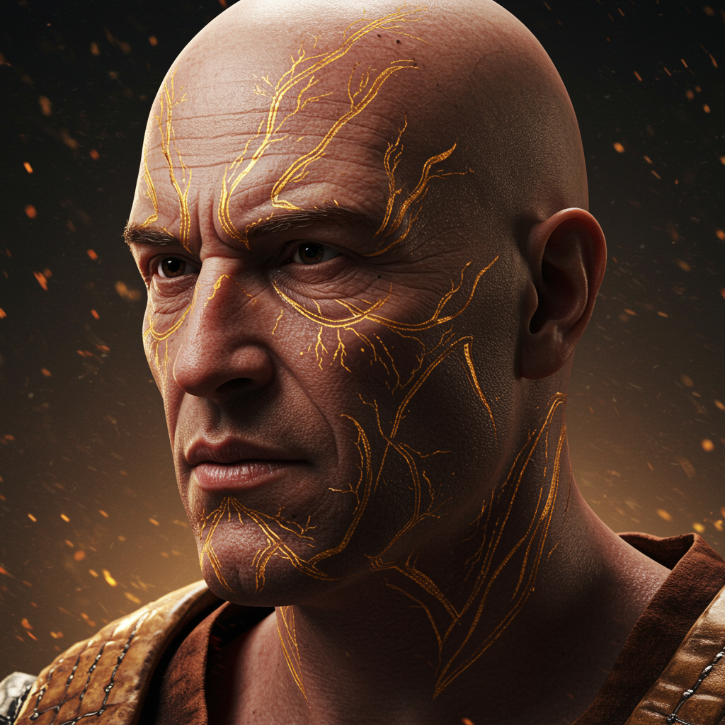 Close up portrait of a bald warrior with intricate gold-patterned veins running across his skin, captured in the style reminiscent of Ben Templesmith, showcasing high-resolution, hyper-realistic details. The cinematic angle adds a sense of depth, with dramatic, dynamic lighting highlighting the contours of his face, and a subtle glow emanates from behind, casting a heroic and mysterious aura.