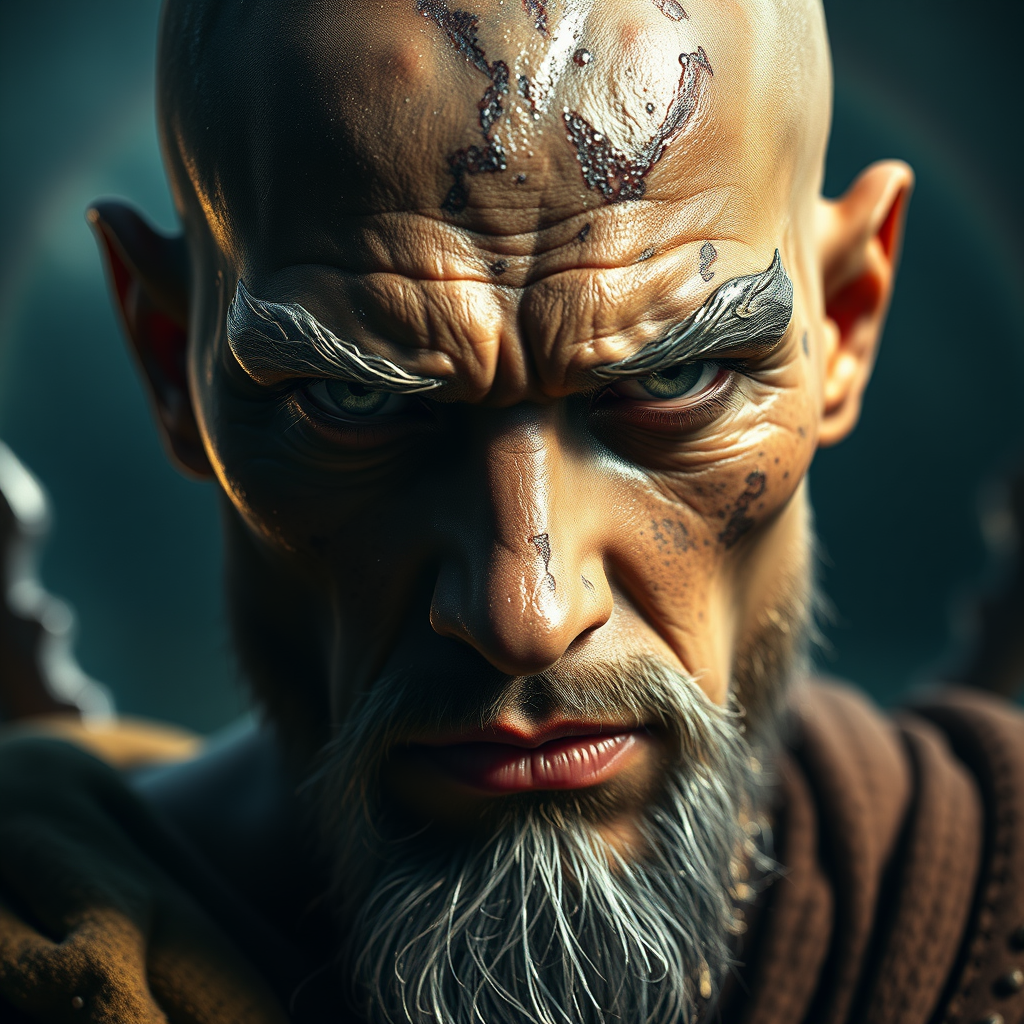 Close up portrait of a bald warrior with shimmering silver veins, influenced by the style of Ben Templesmith, captured in high resolution with ultra-realistic details. The photo showcases a professional quality, highlighting a striking cinematic angle and dynamic backlighting that casts a radiant glow.