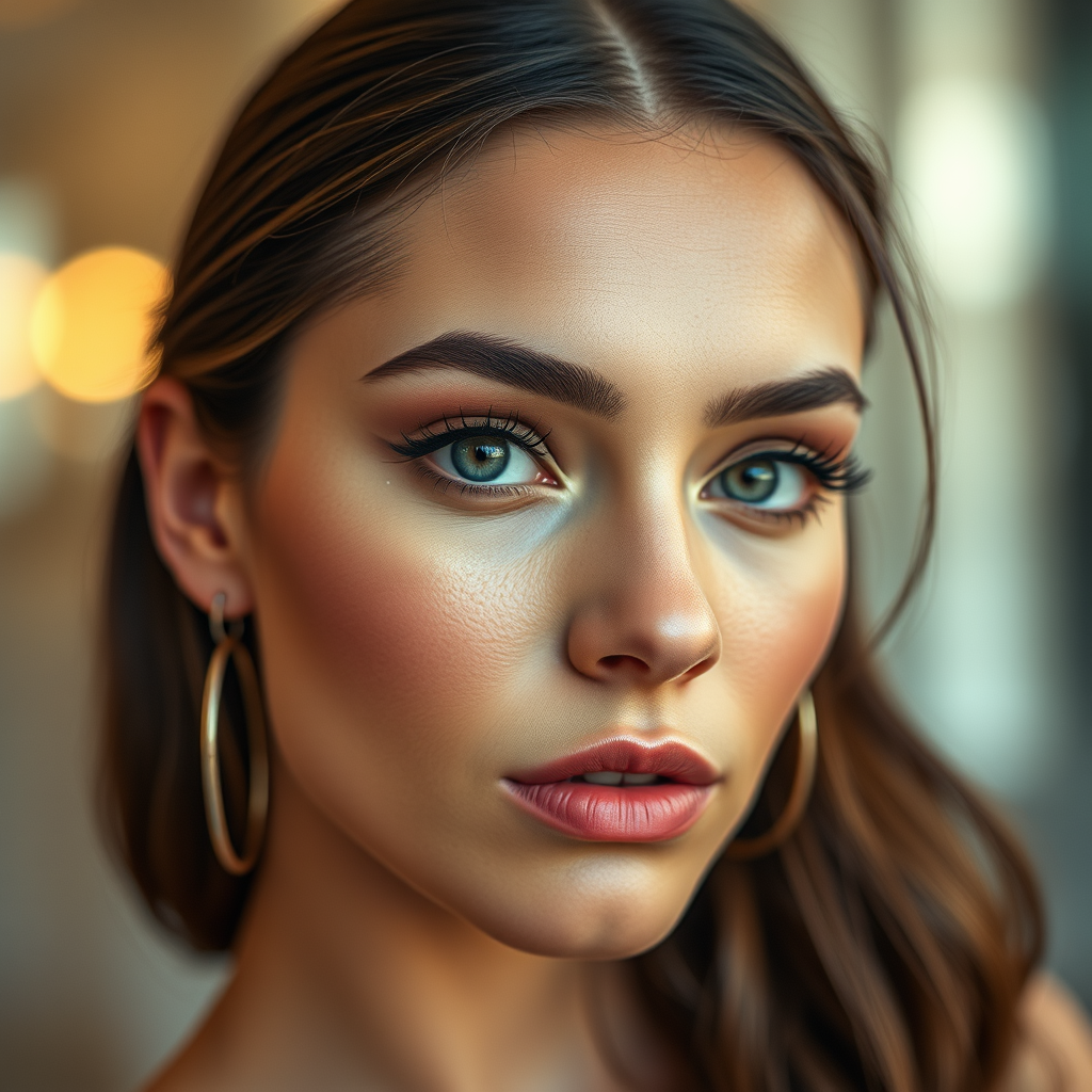 Close-up portrait of a captivating fashion model, hyper-realistic detail, photographed with a Sony A7III, exceptional quality, high contrast, set against a softly blurred background to enhance focus. Features a subtle, sophisticated makeup look and chic hairstyle, emphasizing natural beauty. Lighting highlights the model's expressive eyes and flawless complexion, adding depth and allure. Slightly boosted saturation for a vibrant, modern finish.