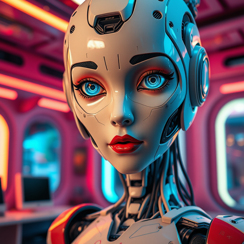 Close-up portrait of a cinematic, intricate robotic girl with a detailed face featuring robotic eyes, nose, mouth, and lips. The android humanoid possesses a detailed robotic body set against an ultra-detailed futuristic room interior, bursting with vibrant colors and high contrast. The scene embodies a masterpiece in vivid HDR, capturing the essence of a futuristic theme. The humanoid face combines big robotic eyes and human-like features such as eyelashes, analogous to a human nose and mouth, presenting a harmonious blend of technology and beauty. The surroundings evoke a sense of wonder and sophistication, highlighted by vibrant details without flaws or distractions like watermark or text. The android's design showcases professional artistry and innovation, standing in sharp relief within the futuristic ambiance.