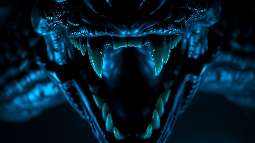Close up portrait of a creature with its mouth open, inspired by the style of Charles Fremont Conner, set against a clear dark background. The image is designed as film key art with a detailed full-body portrayal, showcasing vibrant blue tones reflecting off a sewer environment. The creature's fangs are prominently displayed, emphasizing the theme of a bite. This art piece is meticulously crafted in high resolution, optimized for a 1024px profile picture, capturing the essence of artgeem with subtle creative enhancements.
