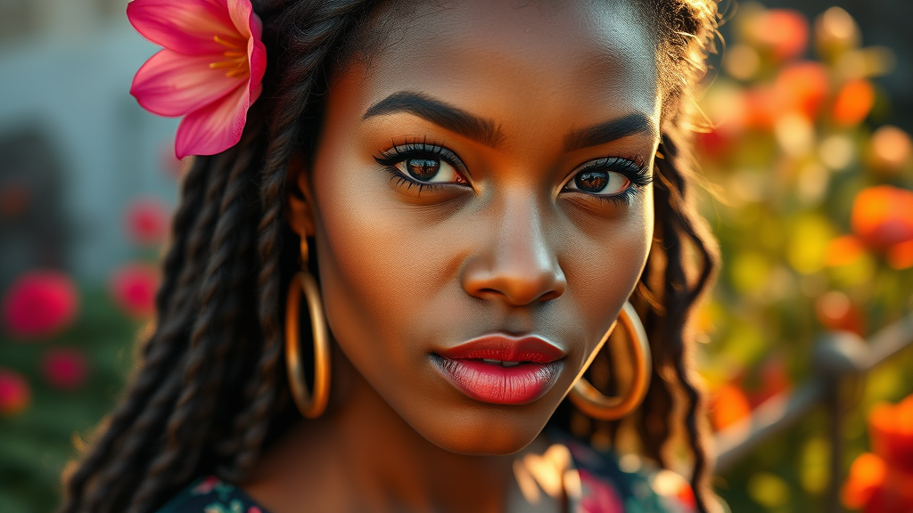 Close-up portrait of a diverse European woman wearing floral-patterned attire, captured in an extremely high-quality photo with an outdoor setting as the backdrop. The image boasts intricate, exquisite detailing and textures, with a warm lighting ambiance. The focus is sharp, showcasing highly detailed eyes. Shot in 8k UHD resolution with a Nikon D850, it features high-quality film grain and hyper-realistic skin, retaining a natural yet striking appearance. Touches of vibrant nature enhance the composition, adding a unique flair to the original concept.