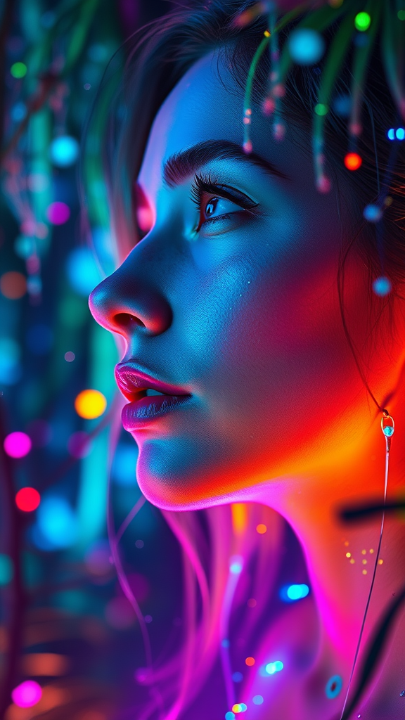Close-up portrait of a dream-like woman, off-centered, gazing into the distance with a serene expression, her skin and features awash in brilliant neon hues, dripping with vibrant colors that mimic bioluminescence and appear to glow. Her environment is an otherworldly forest filled with vivid neon wonders, with particles of light dancing around in shades of blue, green, and purple. The composition is guided by the golden ratio, featuring hyper-maximalist details with cinematic realism, rendered with an octane engine to create photorealistic imagery. The scene presents in a slightly asymmetric composition, capturing the essence of a surreal, vibrant dreamscape in an 8K resolution, reflecting the enchanting chaos of a neon-lit wonderland.