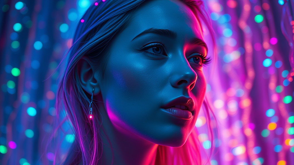 Close-up portrait of a dream-like woman, slightly off-centered, gazing into the distance, embodying an essence of daydreampunk beauty. She is enveloped in a cascade of neon lights, her figure shimmering with colorful, bioluminescent glows. The backdrop is a vivid neon wonderland, a forest alive with particles of blue, green, and purple hues. The composition is highlighted by the golden ratio, embracing a hyper-maximalist style, blending photorealism with cinematic realism. Rendered in octane and Unreal Engine, the scene is captured in 8k with an asymmetric layout, infused with a chaotic energy, creating a surreal and immersive visual experience.