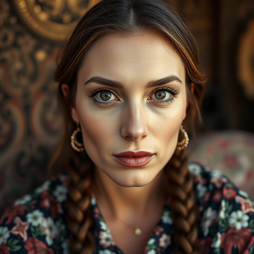 Close-up portrait of a European woman wearing floral-printed clothing, captured in an extremely high-quality photograph. The background is set outdoors with intricate and exquisite details and textures. The scene is lit with warm, natural lighting, ensuring a sharp focus on her face. Her eyes are vividly detailed, and the image is rendered in 8k UHD resolution, shot with a Nikon D850 for a high-quality outcome. The photograph features film grain and hyper-realistic skin tones, bringing a lifelike essence to the portrait, maintaining the essence of CyberRealistic artistry.