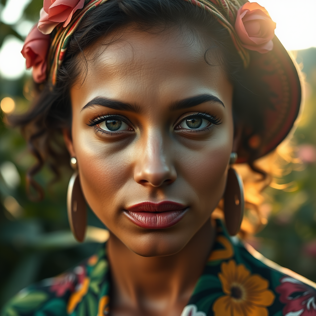 Close-up portrait of a European woman, wearing vibrant botanical-patterned attire, captured in a stunningly high-resolution photograph; set against a lush outdoor backdrop, emphasizing intricate, exquisite details and textures. The image is bathed in warm, gentle lighting, with a sharp focus on her expressive eyes, showcasing an 8k UHD clarity captured with a Nikon D850. The photograph boasts superior quality with subtle film grain and hyper-realistic skin tones, adding depth and lifelike presence to the scene.