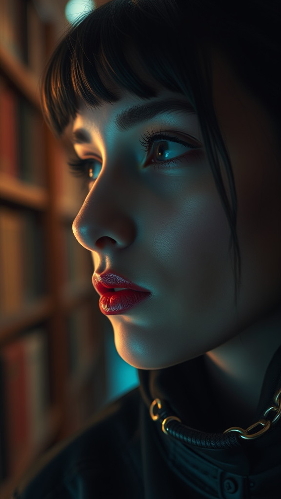 Close-up portrait of a female cyberpunk in a library setting, featuring deep red lips, captured in the evening with hyper-realistic detail at 4k quality resembling fashion photography. The scene is enveloped in moody rim lighting for an intimate portrait composition, enhanced by ray-traced reflections, and using a Cinestill 800T style. The focus is on ultra-detailed facial features delivering a captivating yet serene ambiance. Avoid imperfections like text and errors, ensuring sharp clarity without distractions or distortions.