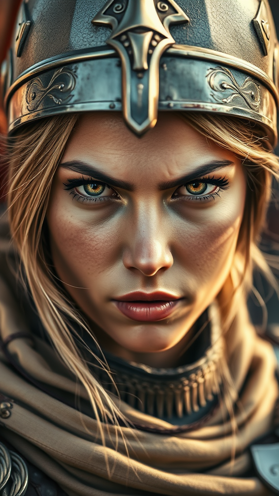 Close-up portrait of a female knight templar on a crusade, centered, highly detailed, breathtaking beauty, comprehensive cinematic, inspired by Karol Bak, showcasing radiant armor and a determined expression, with her helmet slightly tilted revealing strands of hair. Her intense gaze captures strength and grace, embodying the spirit of the crusade with intricate chainmail and a flowing cape adding depth to the image. The background is a subtle hint of a historical setting, enhancing the atmosphere without distraction. The overall composition balances beauty and power, creating an evocative and memorable portrayal.