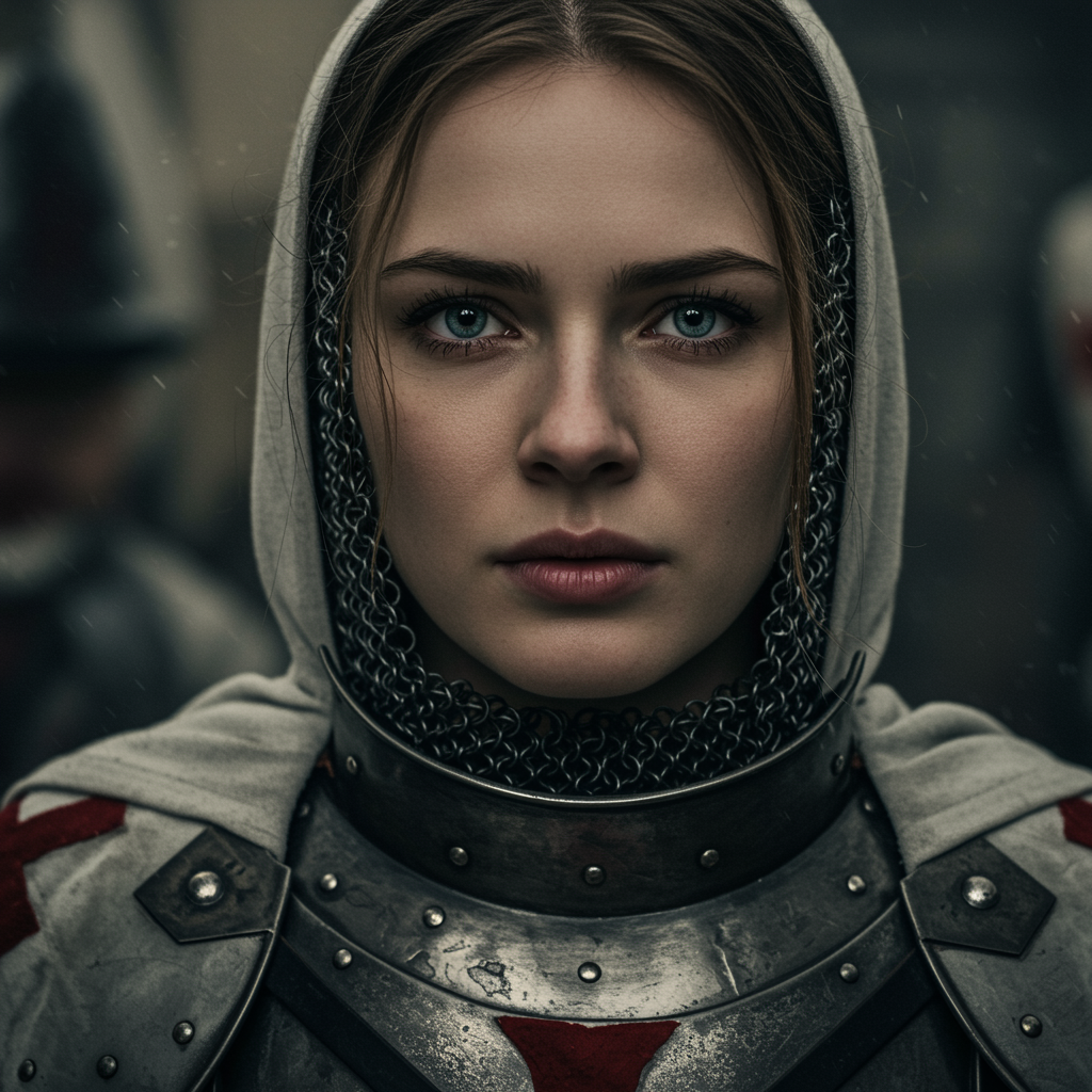 Close-up portrait of a female Knights Templar on a crusade, centered, highly detailed, with breathtaking beauty, inspired by the cinematic style of Karol Bak, showcasing her expressive eyes and intricate armor. The scene captures the essence of medieval valor, highlighting her noble expression and the meticulous design of her attire. The background subtly complements her presence, adding depth without distraction. Her determined gaze suggests unwavering strength and grace, embodying the spirit of the era.