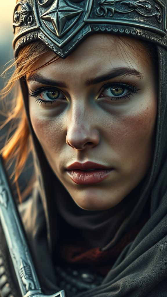 Close-up portrait of a female Knights Templar on a crusade, centered, featuring a highly detailed and breathtakingly beautiful visage. The setting is cinematic with inspiration drawn from the art of Karol Bak, capturing the essence of a determined and noble warrior. The background and details are artistically rendered to avoid common flaws such as low resolution, anatomical inaccuracies, and image distortions. The portrait focuses on the expression and authenticity of the character, ensuring the depiction remains true to the medieval theme without unnecessary distractions or graphical errors. The artwork embraces creativity while maintaining historical and aesthetic integrity.
