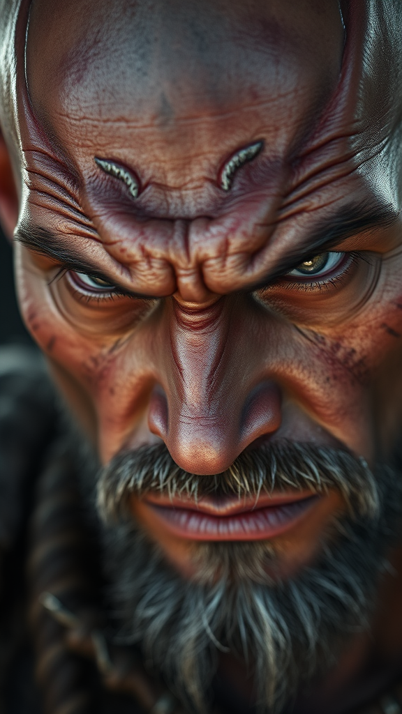 Close up portrait of a fierce bald warrior with shimmering silver veins, inspired by Ben Templesmith's style, showcasing high-resolution, hyper-realistic detail, professional photography quality, captured from a cinematic angle with dramatic backlighting, emphasizing his intense gaze and battle-hardened expression.
