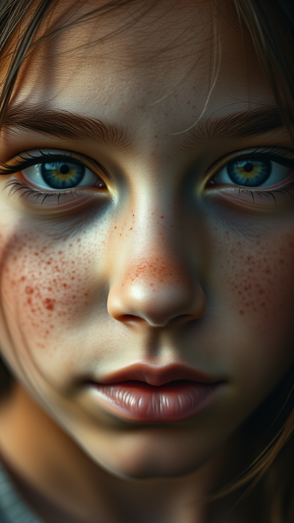 Close-up portrait of a freckled teenage girl with rich, earthy brown skin, evoking the hyperrealistic style of Antoni Pitxot, reminiscent of an epic music album cover. Her expression is tender, timid, and vulnerable, capturing a sense of youthful innocence. The image is inspired by the distinctive charcoal shading reminiscent of Graham Humphreys, highlighting her delicate features and smooth complexion. The setting has an intimate focus, emphasizing her natural beauty and soulful gaze.
