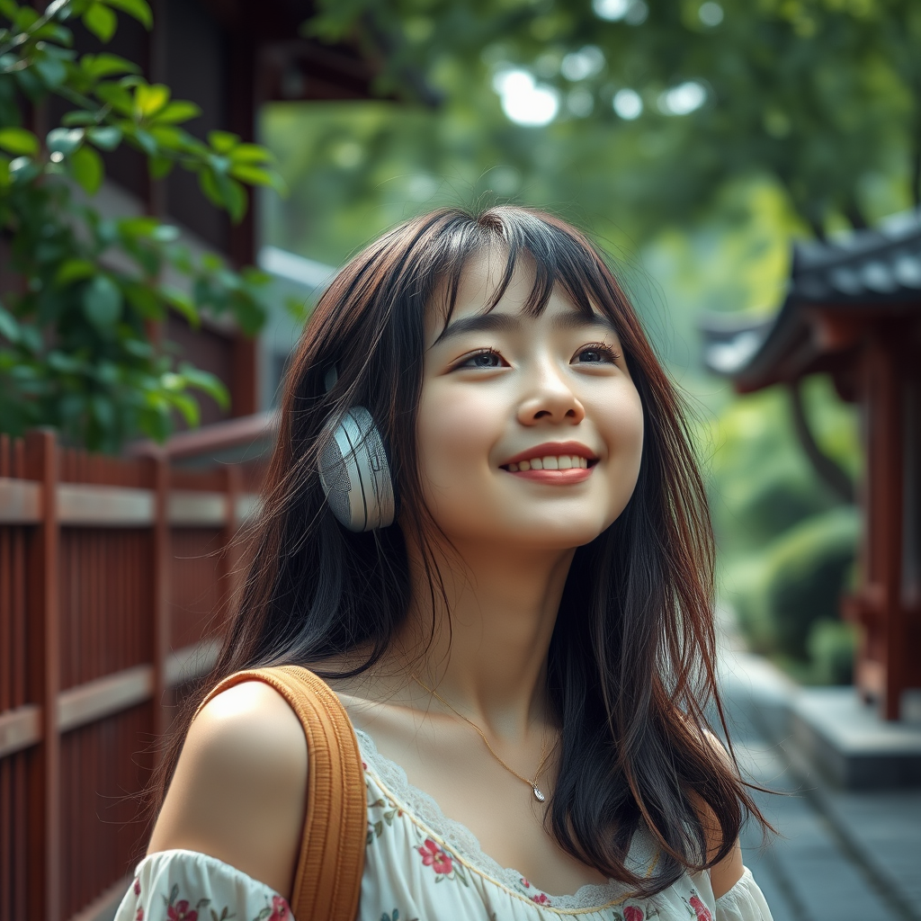 Close-up portrait of a girl enjoying music as she strolls through a serene Japanese landscape in summer. The scene captures her radiant beauty with remarkable detail, evoking a cinematic feel. The girl is centered in the composition, her expression one of pure contentment and immersion in the music. The lush greenery and traditional Japanese elements of the background blend harmoniously, enhancing the tranquil atmosphere. The girl's attire is casual and summery, complementing the season and setting. The focus remains on the emotive connection she feels with the music and her surroundings, creating a captivating narrative moment.