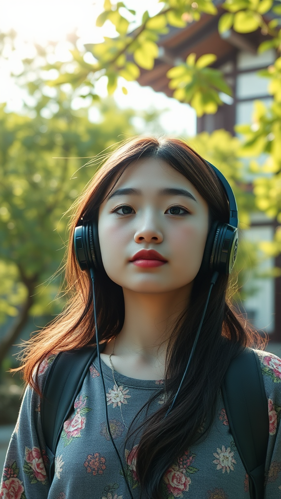 Close-up portrait of a girl enjoying music through headphones as she walks through a serene Japanese landscape in summer; the scene features detailed and breathtaking natural beauty with a cinematic feel. Her peaceful expression is centered, highlighting her connection to the music and environment. The sun casts a warm glow, enhancing the vibrant green of the foliage and the delicate pattern of traditional Japanese architecture in the background. The composition is free of distractions, emphasizing the harmony between the girl and her surroundings.