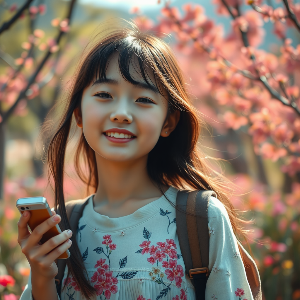 Close-up portrait of a girl enjoying music while strolling through a vibrant Japanese landscape in summer. She is centered in the composition, with an emphasis on highly detailed and breathtaking beauty in a cinematic style. The serene setting amplifies her peaceful expression as she immerses in the moment. The image captures the essence of tranquility and the harmony between her and the surrounding nature.