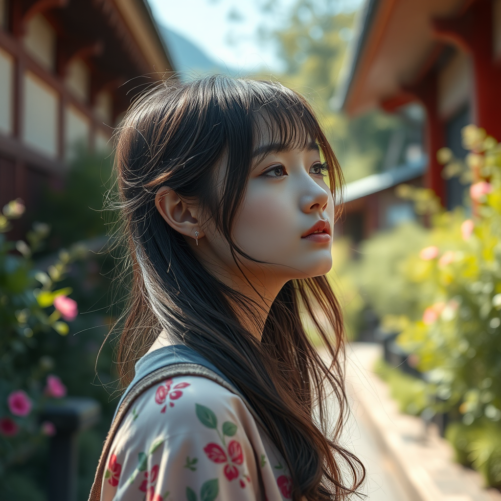 Close-up portrait of a girl listening to music while walking through a serene Japanese landscape in summer, centered. The scene is highly detailed, capturing her breathtaking beauty in a comprehensive cinematic style reminiscent of Lois van Baarle. The focus is on her peaceful expression as she immerses in the melodies, surrounded by the vibrant colors of nature. Her hair gently flows with the breeze, and the sunlight softly illuminates her features. The background hints at lush greenery and traditional Japanese architecture, adding to the tranquil atmosphere. The composition avoids unnecessary elements and distractions, ensuring a pure and harmonious depiction.