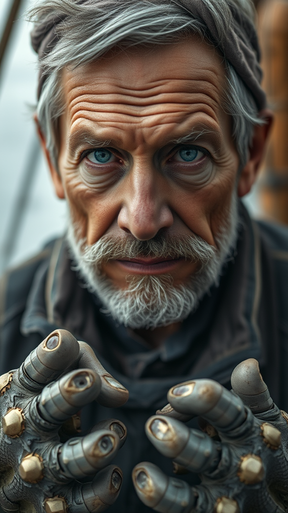 Close-up portrait of a grizzled 50-year-old fisherman with a rugged charm, capturing his enigmatic robot eyes. The scene is slightly out of focus with a dreamlike blur, lending a surreal, otherworldly quality. His anatomy features unusual, elongated limbs, with additional appendages hinting at a supernatural essence. His hands and feet are enigmatically rendered, existing on the threshold of realism and abstraction. His features are subtly distorted, reflecting a life sculpted by the sea and technological enhancement. This imaginative depiction showcases a balance of realism and fantasy, where the boundaries of humanity and machine merge.