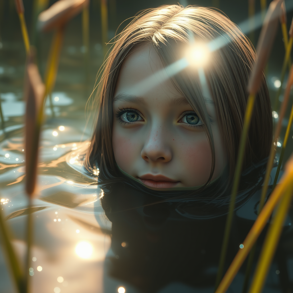 Close up portrait of a long haired teenager swimming in a serene pond, surrounded by gently swaying reeds, captured in a realistic and captivating style. The scene is a masterpiece of digital painting with lens flare softly illuminating the water, casting playful shades and creating a dreamy bloom effect. The influence of Jeremy Lipking and Antonio J. Manzanedo is evident in the artistry, while the composition features a blend of 3D rendering and subtle cartoon elements, enhancing the youthful vibrancy and tranquil atmosphere.