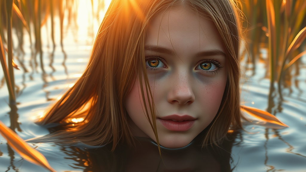 Close up portrait of a long-haired teenager wading through a serene lake surrounded by gently swaying reeds, depicted with a blend of realism and stylized artistry. The scene captures the golden lens flare from the setting sun, casting playful shades and soft blooms across the water's surface. Inspired by the styles of Jeremy Lipking and Antonio J. Manzanedo, the digital painting integrates elements of 3D rendering with subtle cartoon accents, resulting in a masterpiece of the highest quality focused on youthful tranquility and nature's beauty.