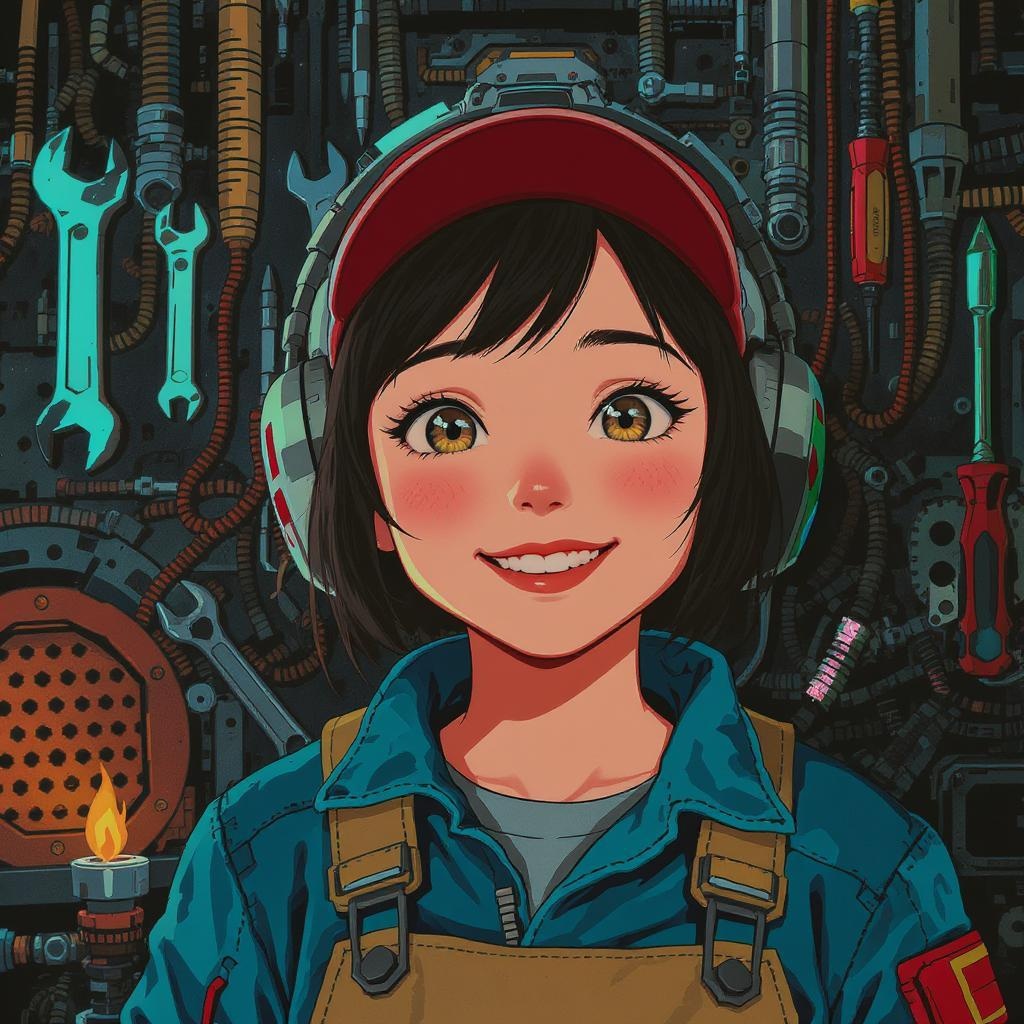 Close-up portrait of a mechanic young girl, centered and cinematic, enjoying afternoon time with a cute, happy, and energetic demeanor. Her face displays detailed features with innocent, expressive eyes, a well-defined nose, and a warm, inviting smile. The ultra-detailed interior behind her is a dystopian mechanic setting, filled with an array of intricate tools including a wrench and screwdriver. The composition is a vibrant 2D digital illustration, designed with flat colors and inspired by cyberpunk themes like Ghost in the Shell. The scene conveys a sense of adventure and curiosity, with the girl's youthful enthusiasm contrasted against the complex, machinery-filled backdrop. The artwork is a visual masterpiece with stunning detail that captures the essence of a vibrant and dynamic environment.