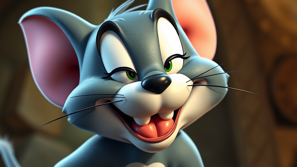 Close-up portrait of a mischievous Jerry the mouse, plotting devious tricks, sporting a sly grin on his face, intricately detailed 3D render in vibrant shades reminiscent of Jerry from Tom & Jerry by Hanna-Barbera productions, set against an exaggerated dynamic background in a cinematic 16:9 aspect ratio.