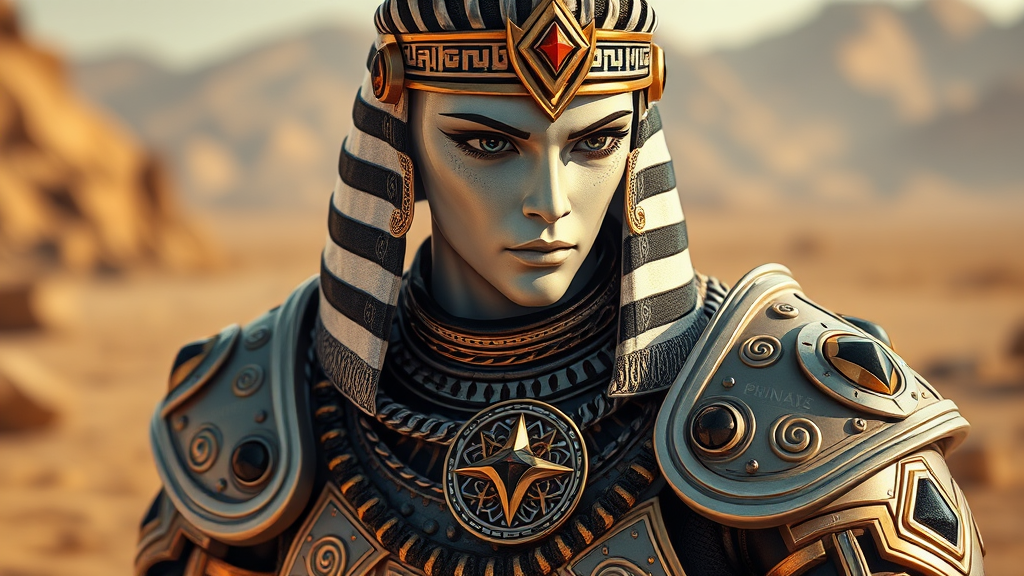 Close-up portrait of a Nubian monarch from ancient Egypt striding into a desolate land, adorned in metallic armor of white, black, and gold hues. His face is porcelain-like with mechanical elements, inspired by baroque rococo artistry. The scene is illuminated with cinematic lighting that follows the golden ratio. He strikes a dynamic pose, reminiscent of a character from a fantasy game. The armor is adorned with an energetic crystal chain and bears a metallic sigil with cryptic inscriptions. The gold accents are intricate, wrapping around an elaborate, 3D altar that hints at ritualistic significance. His pineal gland is subtly emphasized, surrounded by highly detailed ornaments encrusted with black gems. The scene is rendered with ambient occlusion and high-key photography, creating a beautiful bokeh effect. The entire composition is hyper-realistic and photorealistic, showcasing an insanely detailed and ornate design with diamond-shaped motifs. The style is hypermaximalist yet elegant, skillfully blending elements of cartoons, anime, and sketches for a unique visual tapestry.