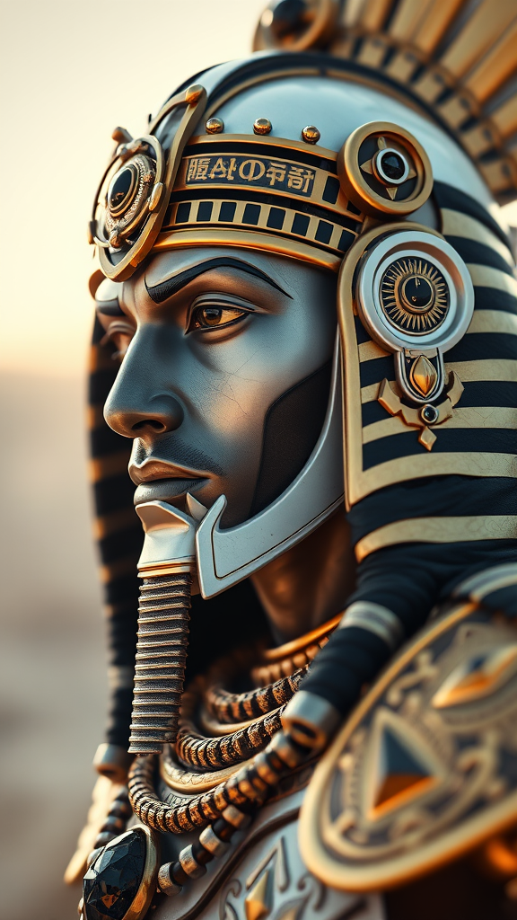 Close-up portrait of a regal Nubian king from ancient Egypt entering an uncharted expanse, donning intricately designed metallic armor in hues of white, black, and gold. His porcelain face features mechanical accents, drawing inspiration from baroque and rococo styles. The scene is lit with cinematic flair, adhering to the golden ratio. Evocative of a League of Legends character, he strikes a dynamic pose, wearing armor adorned with detailed, energetic crystal chains. His sigil-engraved armor bears cryptic writings and is infused with elaborate gold detailing. The setting includes a highly ornate 3D altar, with emphasis on the pineal gland. The ornaments on his armor include crystallized black gems, with ambient occlusion enhancing the high-key photography. The background exhibits beautiful bokeh effects in 8K resolution. The design incorporates metallic diamond patterns in gold, achieving a photorealistic, hyper-detailed, and intricate look. The style is hyper-maximalist, elegant, and ornate, merging hyper-realism with elements of cartoon and anime sketches.