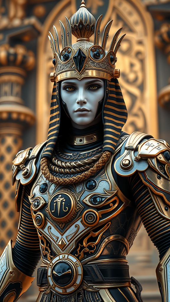 Close-up portrait of a regal Nubian king from ancient Egypt striding confidently into uncharted terriotory, his metallic armor gleaming in shades of white, black, and gold. His porcelain-like face features mechanical elements, embodying a fusion of baroque rococo style with an air of League of Legends fantasy. Cinematic lighting highlights his dynamic pose and the intricate design of his armor adorned with energetic crystal chains and cryptic writing. His sigil-emblazoned cuirass reflects the ritual significance, with intricate gold detailing and crystallized black gems enhancing its majestic aura. Amidst a highly detailed ornate surrounding, a 3D altar captures the essence of the pineal gland symbol. The scenery, rich with ambient occlusion, contrasts highkey photography with bokeh effects, rendering a photorealistic landscape at 8K resolution. The composition is characterized by metal diamond patterns and hyper-realistic detail, exuding elegance with a hypermaximalist touch, blending elements of cartoon, anime, and sketches into an exquisite display.