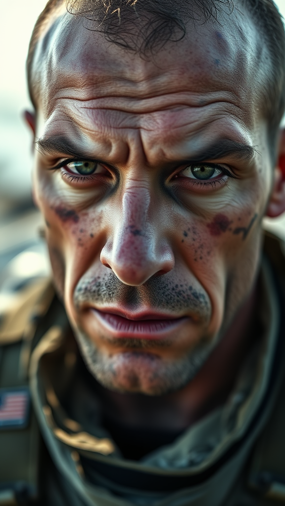 Close-up portrait of a rugged navy seal with intense green eyes and battle scars, wearing a slightly weathered navy seal uniform, standing on an aircraft carrier deck under natural lighting, the depth of field creating a soft background blur, captured with a 50mm lens, F1.4 for a slightly more pronounced focus on facial details.