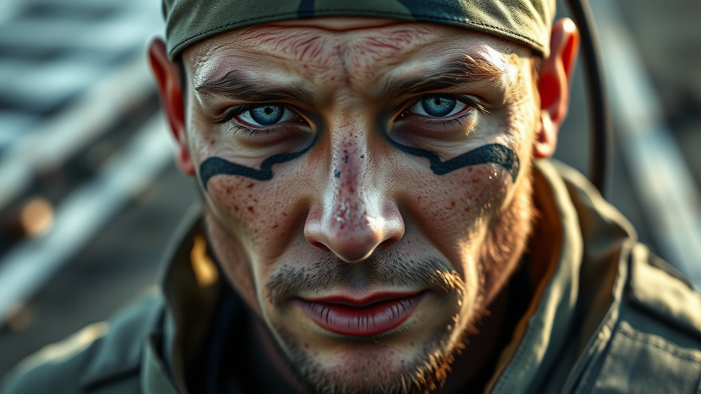 Close-up portrait of a rugged navy seal with striking blue eyes and sun-weathered skin, wearing camo face paint, a few battle scars visible. Clad in a slightly weathered navy seal uniform, he stands confidently on the deck of an aircraft carrier. The portrait is captured with a 50mm lens in soft, natural lighting, using an aperture of F1.4 to enhance the depth of field.