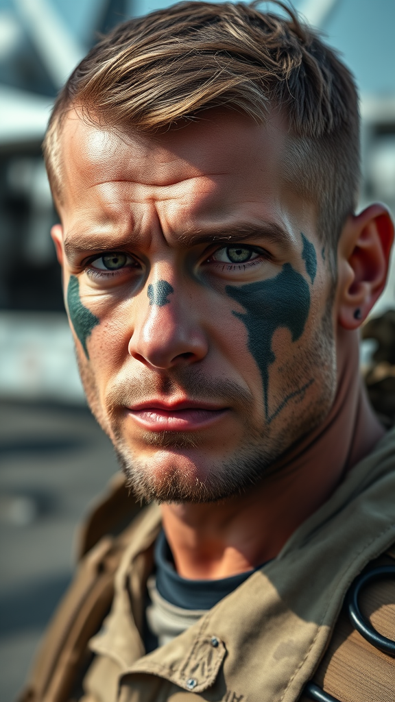 Close-up portrait of a ruggedly handsome navy seal with distinguished green eyes and weathered scars, adorned with camouflaged face paint. He stands in a navy seal uniform against the backdrop of an aircraft carrier. The photograph is captured with a 50mm lens in natural lighting, at F1.2, accentuating the determination on his face and the strength of character etched in his expression.